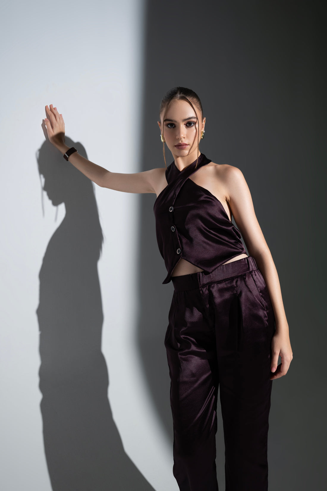 Backless Cross Neck Satin Co-ord Set ( Brown )