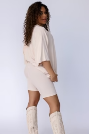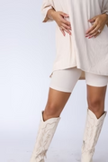 The set you have all been waiting for is here! You will be dressing this up for every occasion and dressing it down to wear around the house. This set was made for EVERYBODY. This oversized boyfriend tee comes with a pair of matching biker shorts. The material is soft, very stretchy and ribbed. The best part about these biker shorts is they do not cut into your waist, they lay flat. They are tight enough to hold you in, but loose enough to feel relaxed and comfortable. The relaxed fit of this outfit has made it a 10/10.